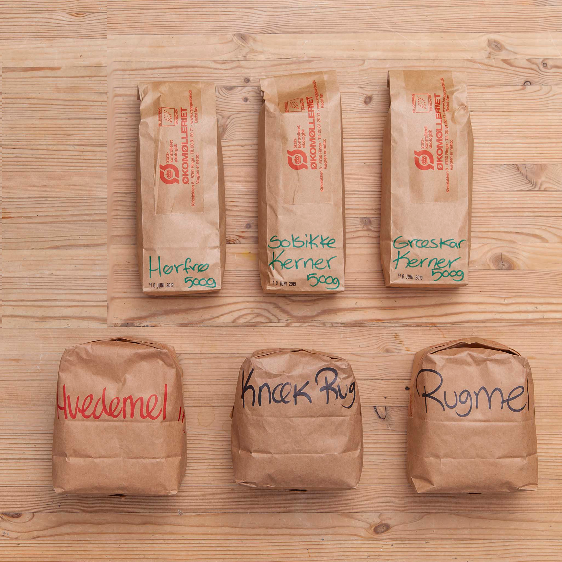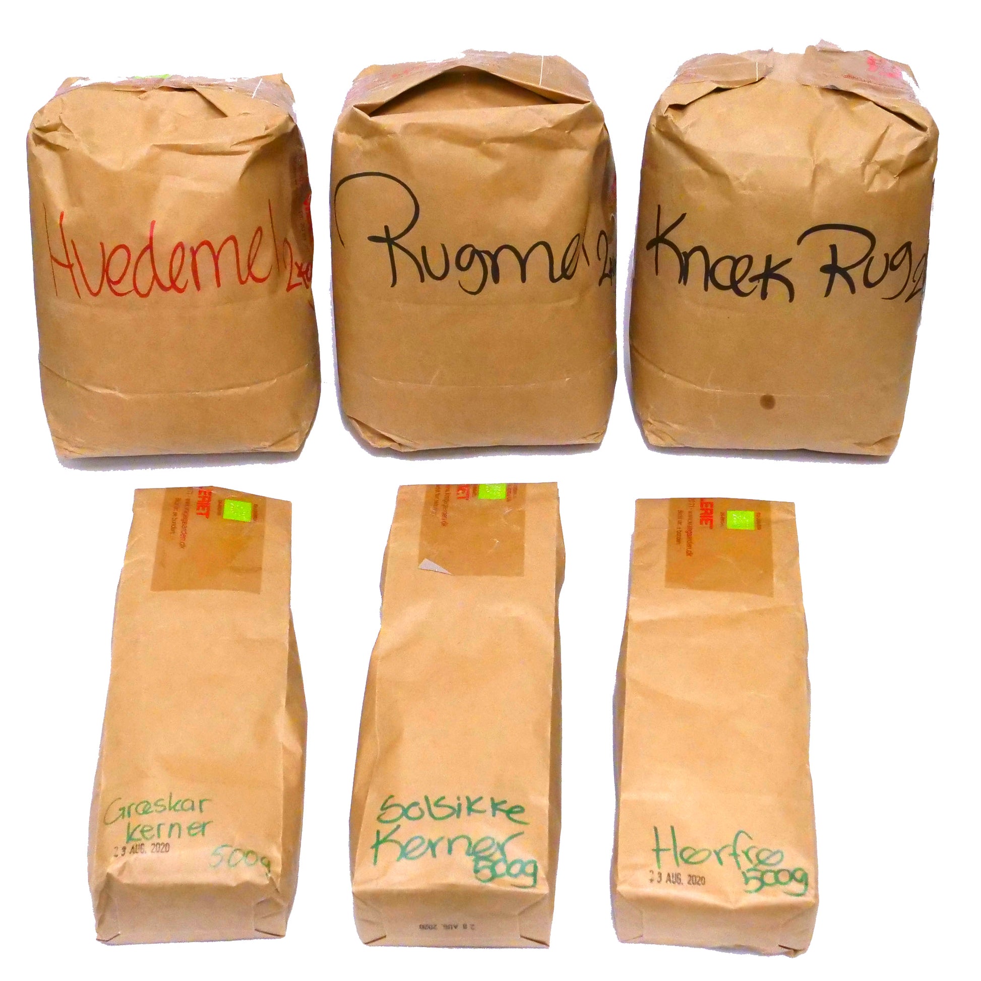Du får 2kg rugmel, 2 kg knækkede rugkerner, 2kg hvedemel, 500gr solsikkekerner, 500gr hørfrø og 500gr græskarkerner økologisk og friskmalet.