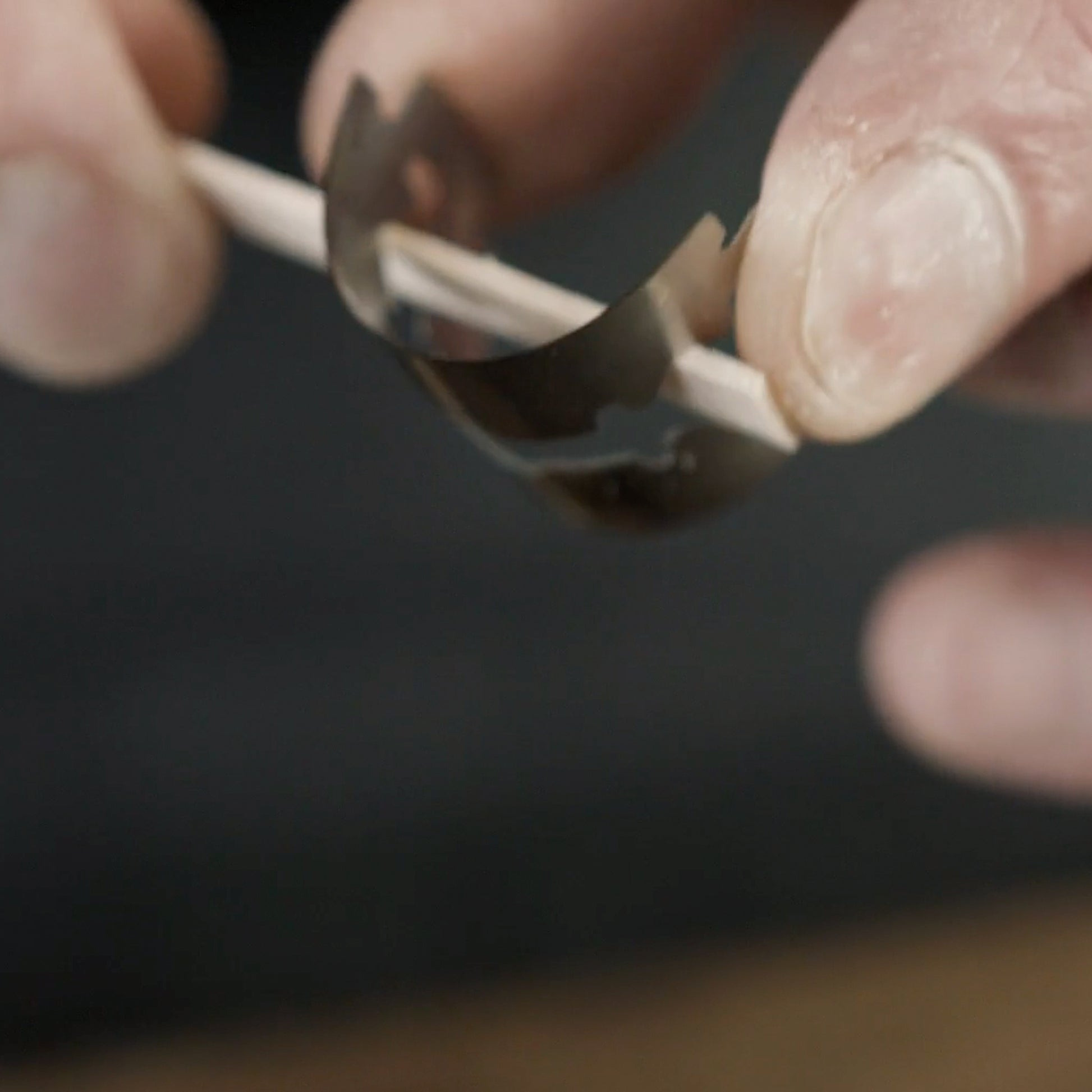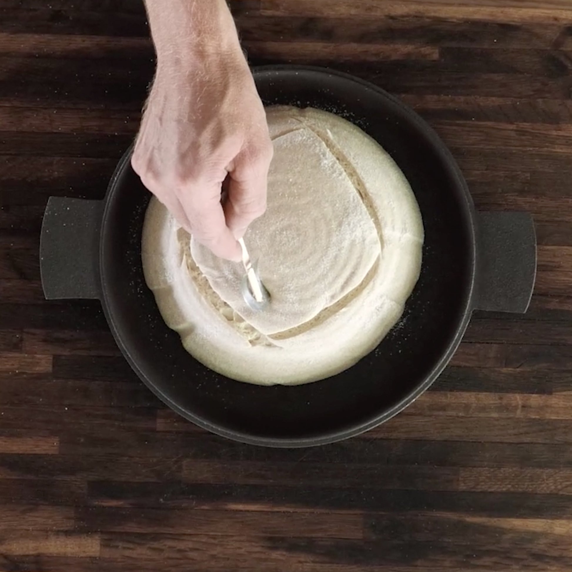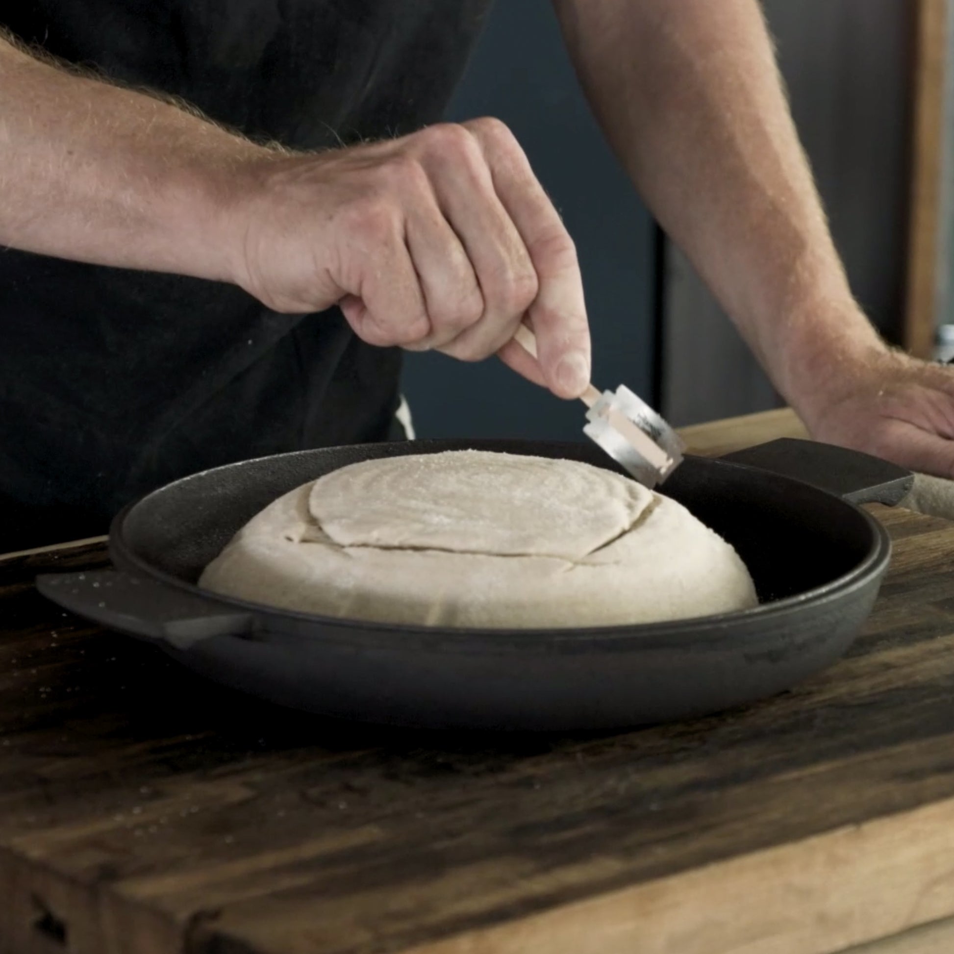 The best and simplest paring knife is a razor blade mounted on half a coffee stir stick. It provides a perfectly curved blade that helps the cut to open up and gives the coveted ear to the bright sourdough bread.