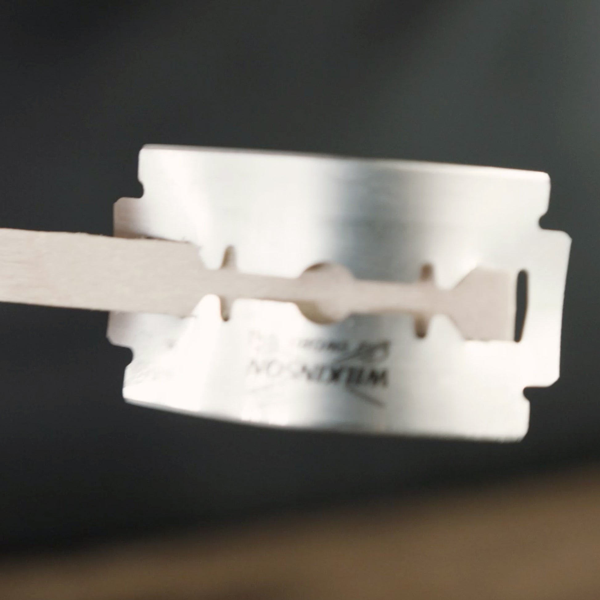 Supplied in a pack with five razor blades, two stirring sticks and instructions. Mounted by carefully bending the razor blade between two fingers so that the stirring stick can be inserted and clamped in two of the razor blade's holes.