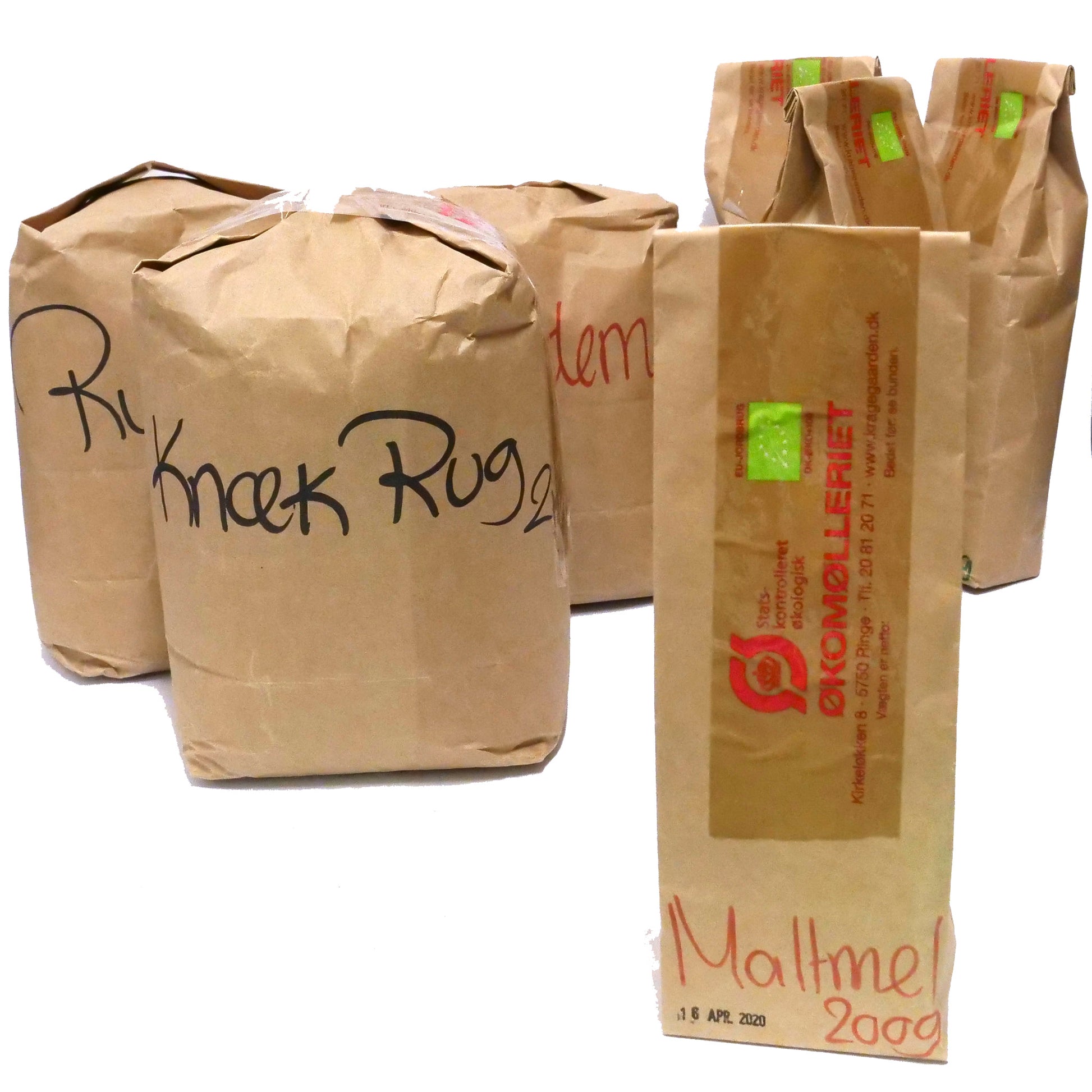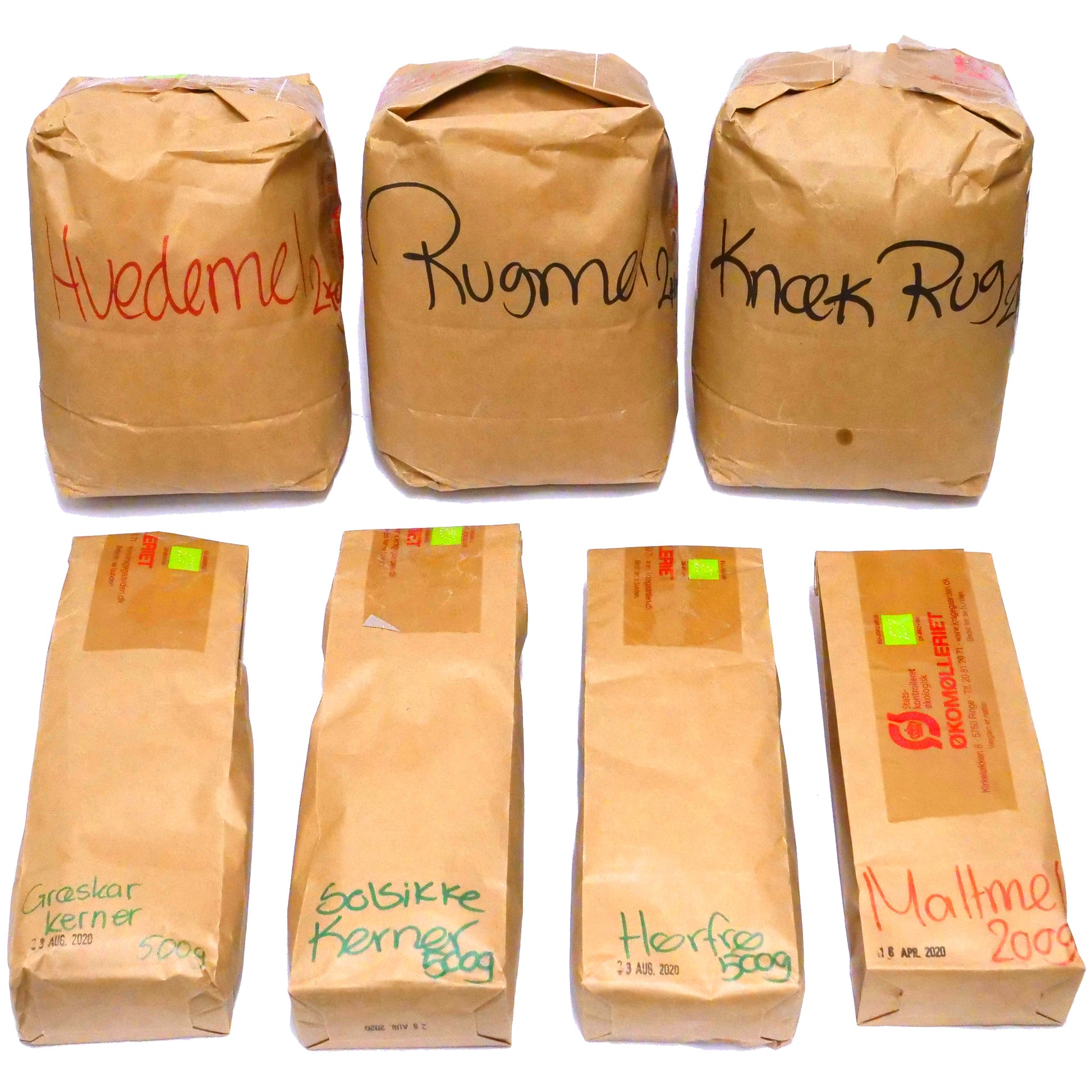 Du får 2kg rugmel, 2kg knækkede rugkerner, 2kg hvedemel, 500gr solsikkekerner, 500gr hørfrø, 500gr græskarkerner og 200gr Mørkt malt økologisk og friskmalet.