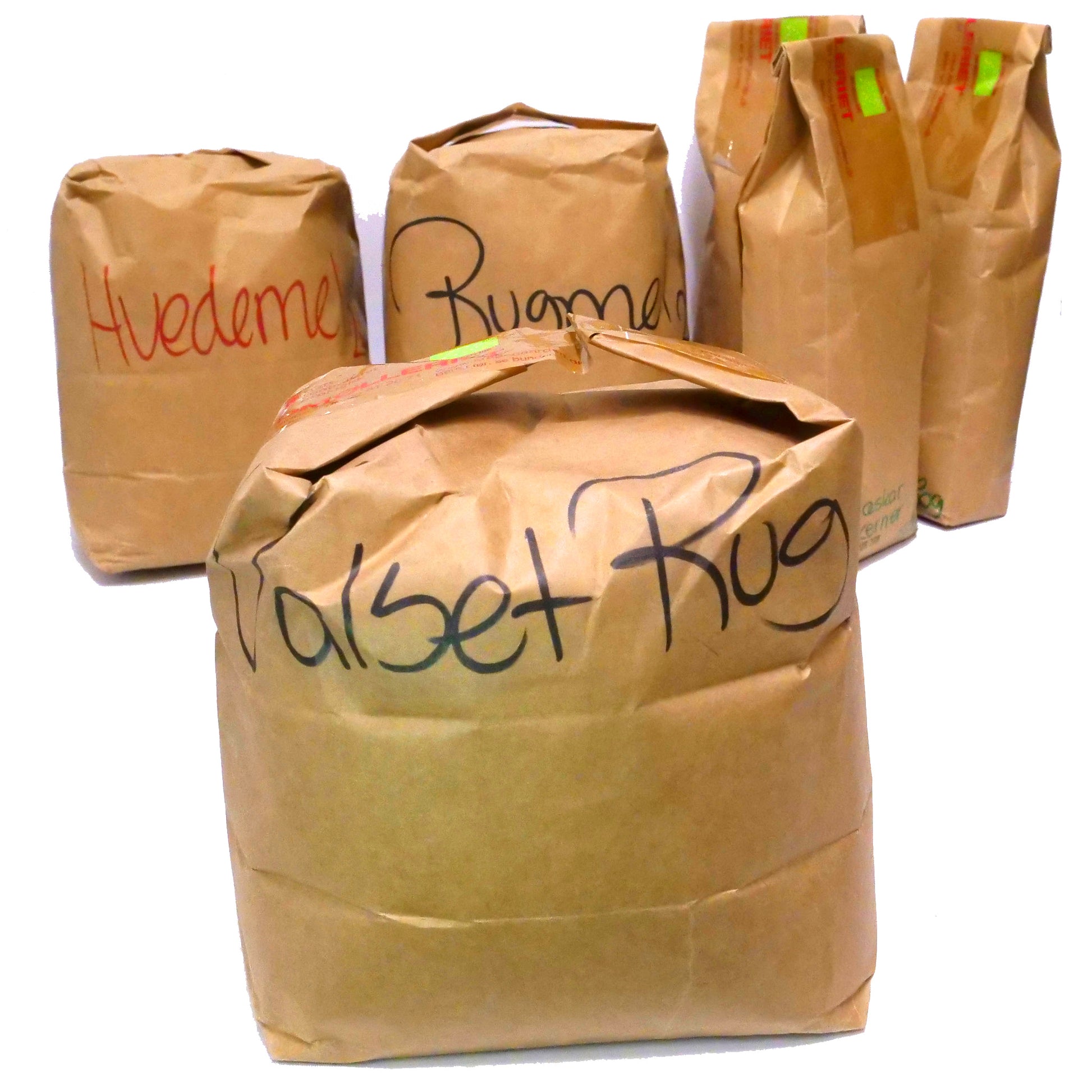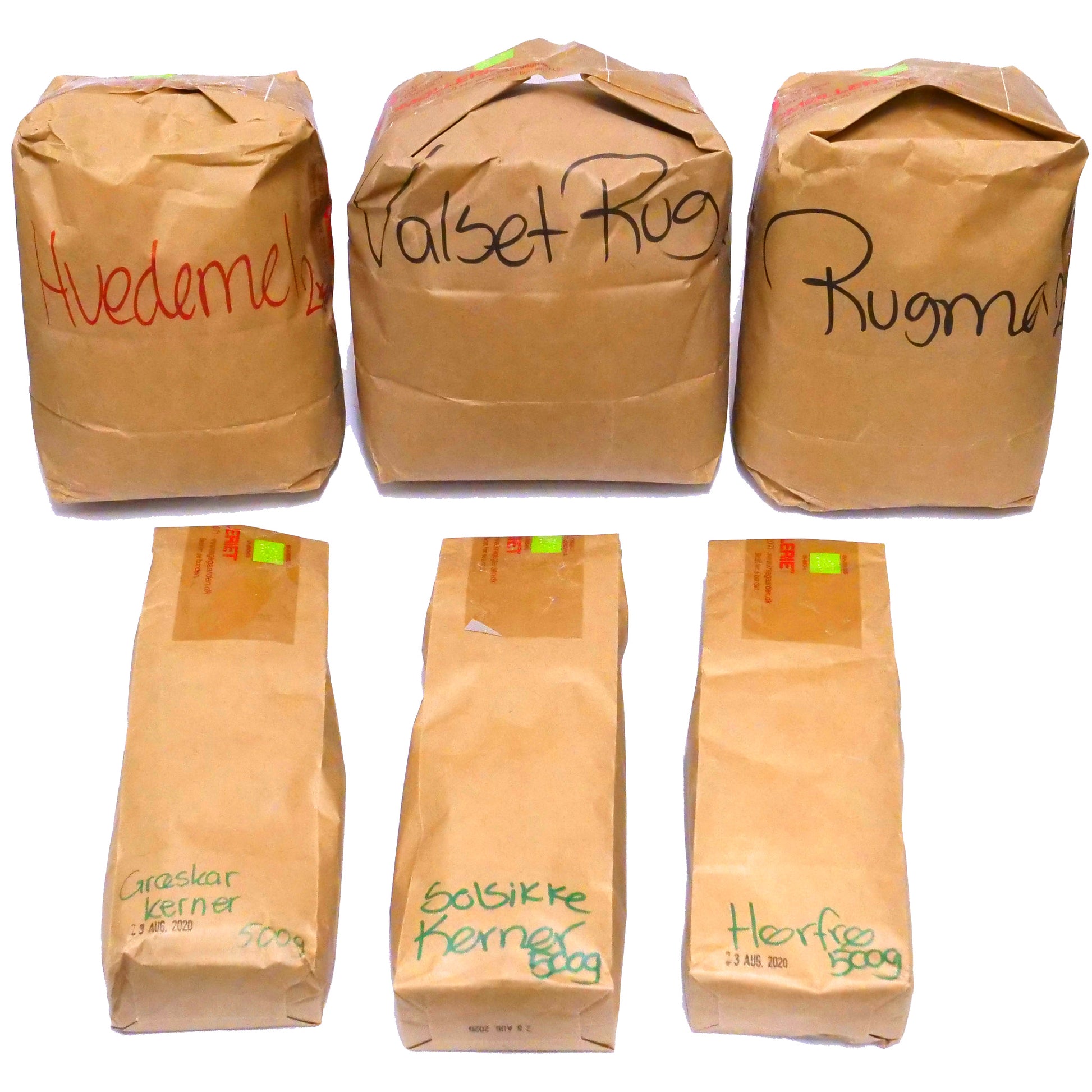 Du får 2kg rugmel, 2kg valsede rugkerner, 2kg hvedemel, 500gr solsikkekerner, 500gr hørfrø og 500gr græskarkerner økologisk og friskmalet.